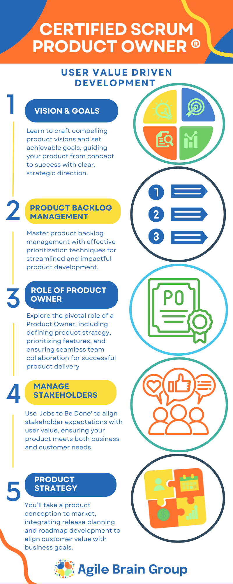 Master Product Management with our Certified Scrum Product Owner ® workshop. Dive into customer value-driven development, where you'll start with a product idea to Vision, Product Goals, strategic roadmaps, release planning, and practical Jobs-To-Be-Done techniques. Network, learn from a world-class Certified Scrum Trainer (CST®), and gain a coveted certification.